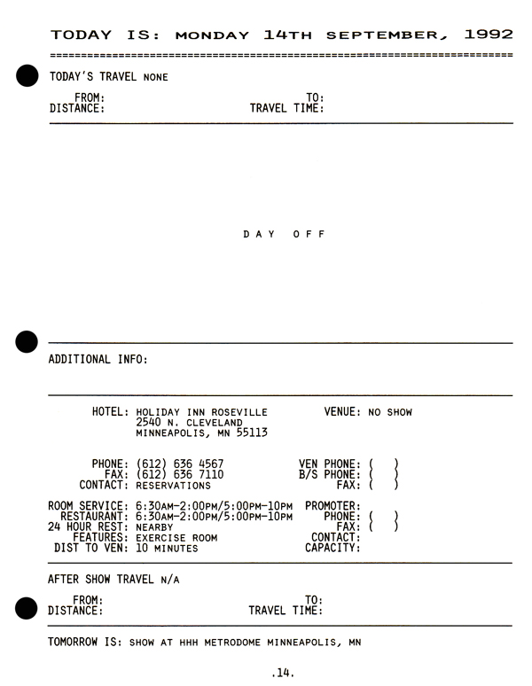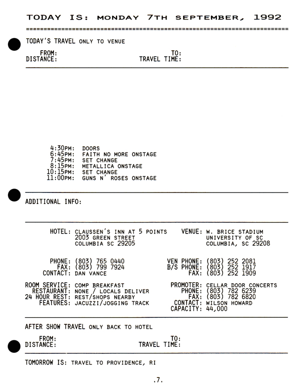 72 Page Tour Itinerary From The 1992 US Tour Supporting Metallica And Gun's N' Roses.